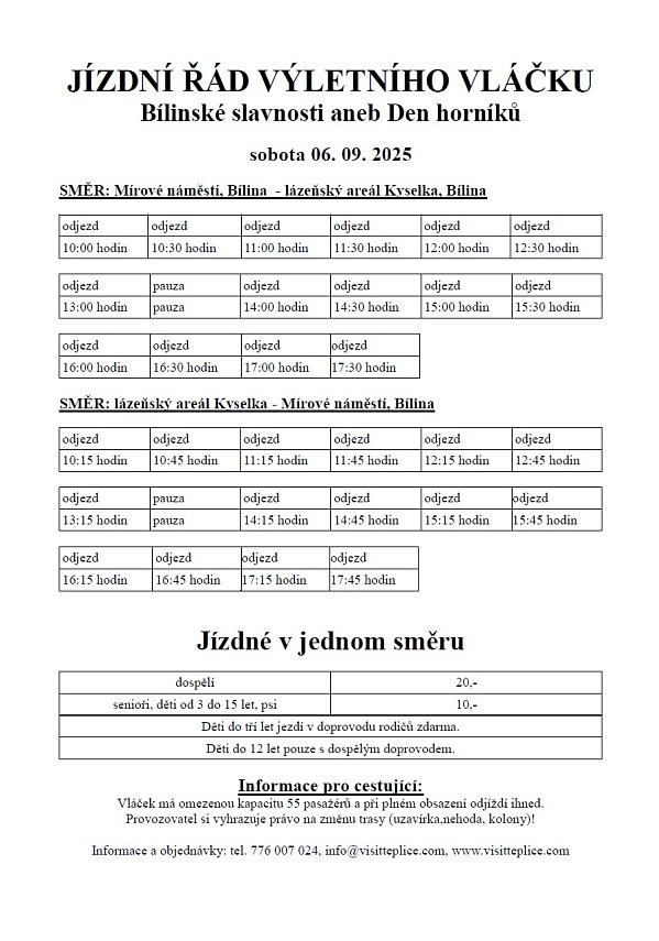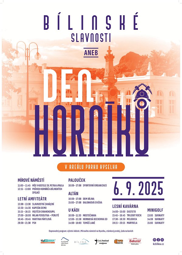 dovolujeme si Vás pozvat na tradiční Bílinské slavnosti aneb Den horníků, které se v Bílině uskuteční v sobotu 6. září 2025 na Kyselce. Slavnostní zahájení, v rámci kterého bude předáváno i ocenění bílinským občanům, proběhne ve 13:00 hodin na letním amfiteátru.